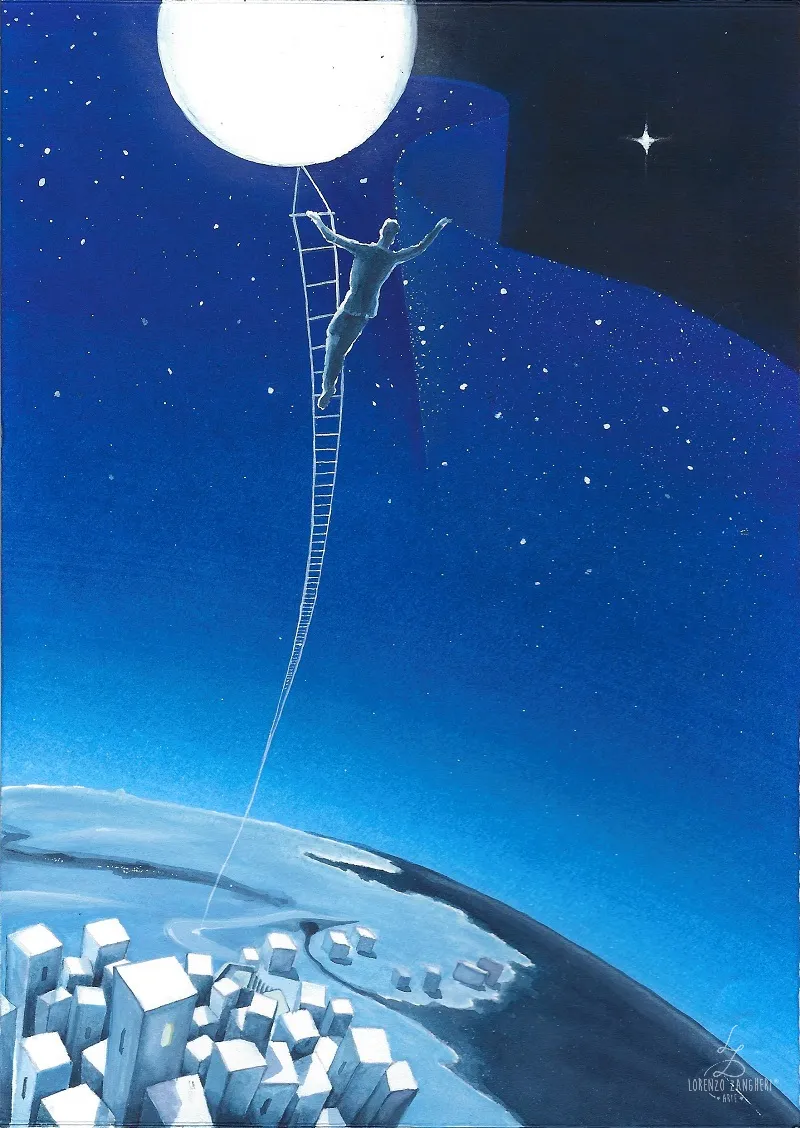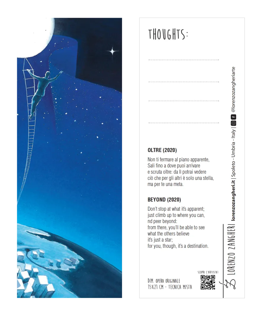 Bookmark printed on a pearly paper sheet, taken from Lorenzo Zangheri’s original drawing Beyond. It may be bundle-purchased with the relative Author’s greeting card.
