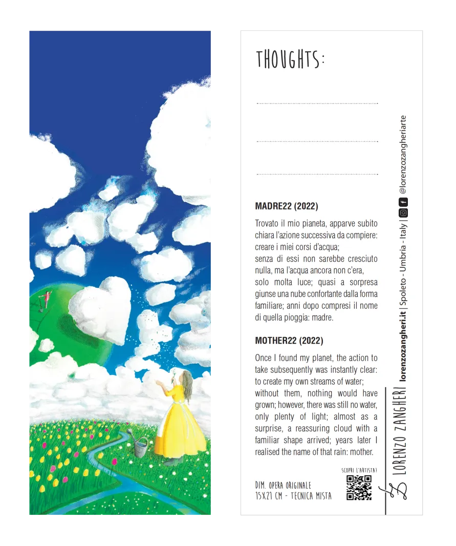 Bookmark printed on a pearly paper sheet, taken from Lorenzo Zangheri’s original drawing Mother 2022. It may be bundle-purchased with the relative Author’s greeting card.
