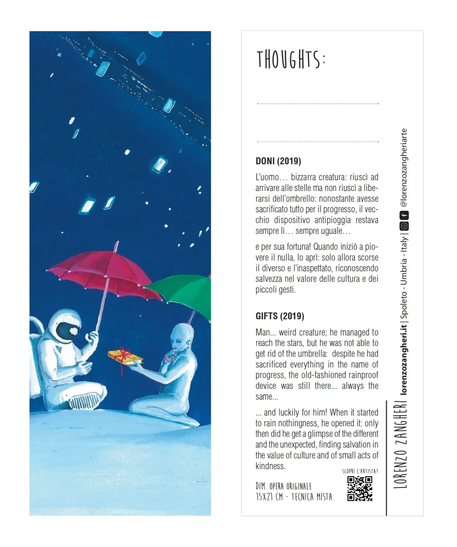 Biglietto artistico con a fronte pagina l'opera originale dellโartista Lorenzo Zangheri dal titolo Doni. Soggetto figurativo-concettuale realizzato con tecnica mista e riprodotto tramite stampa su carta martellata tipo โModiglianiโ 260 gr in formato 115ร158 mm.