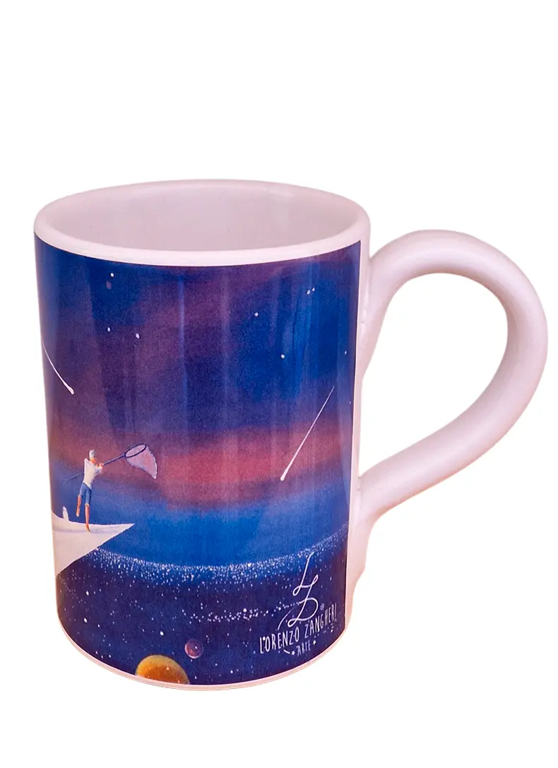 Mug in ceramica bianca Made in Umbria riproducente l’opera originale “Acchiappastelle” con relativa nota poetica