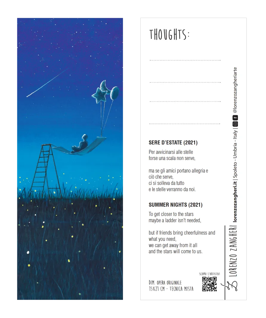 Segnalibro in carta perlacea tratto da Sere d’estate, illustrazione originale di Lorenzo Zangheri. Può essere acquistato in bundle col corrispondente biglietto d’autore.