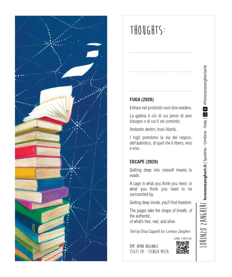 Elegante segnalibro comprensivo di nota poetica dell’artista, scritta in italiano e in inglese. Il soggetto, stampato su carta perlacea di alta qualità, è un dettaglio dell’opera omonima pensata e realizzata da Lorenzo Zangheri.
