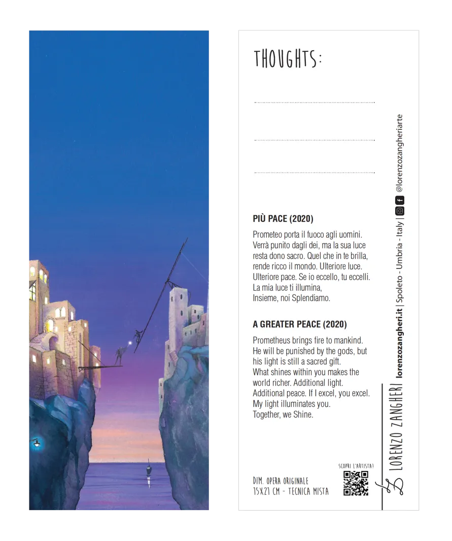 Segnalibro in carta perlacea tratto da Più pace, illustrazione originale di Lorenzo Zangheri. Può essere acquistato in bundle col corrispondente biglietto d’autore.